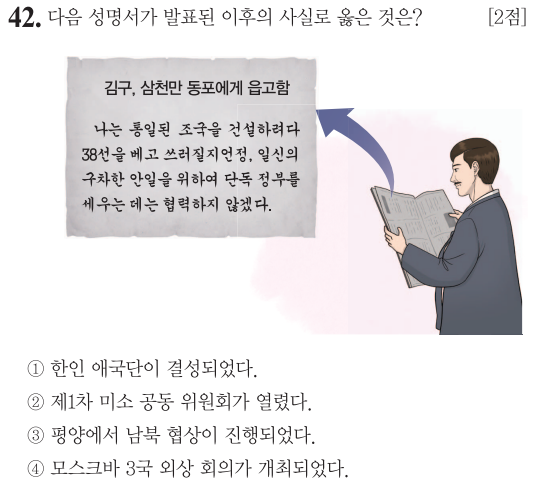 ③ 납북협상의 시대적 배경을 살펴보면 제1차에 이어 제2차 미소 공동위원회(1947년)도 결렬되었고 남한만의 단독선거인 5.10총선거를 치르려하는 상황이었습니다. 민족지도자인 김구, 김규식 등은 1948년 4월 김일성을 만나 민족통합과 통일국가 수립을 위해 평양으로 가서 김일성을 만났으나 이는 김일성의 위대함을 알리는 들러리 역할을 했을뿐 남쪽 지도자들의 의도와는 전혀 다른 방향으로 의미없는... 아무 결론도 나지 않는 상황으로 결렬되었습니다.