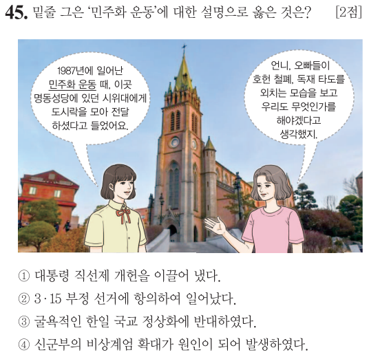③ 한일국교정상화는 1965년에 한일의정서를 발표하면서 이뤄졌고 1년 전인 1964년에 이를 반대하는 시위가 열렸습니다.