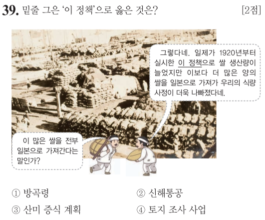 ③ 산미증식계획은 1920년대에 실시한 일제시대 경제정책으로 말 그대로 쌀 생산량이 증가하기는 했지만 일본으로 유출되는 쌀의 량이 많아 되려 조선 백성 1인당 소비량은 현저하게 줄어들게 되었습니다.