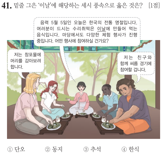 ① 단오는 음력 5월 5일에 있는 날로 모내기를 끝내고 풍년을 기원하며 여자는 창포물에 머리감고 남자는 씨름을 하는 풍습이 있습니다.