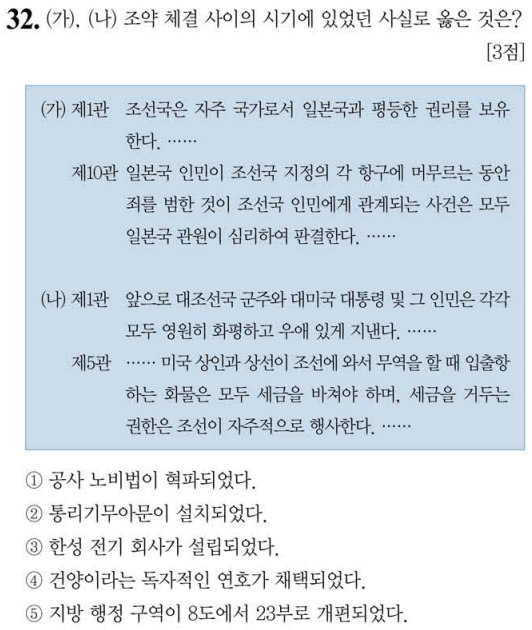 (가) 1876년 강화도조약입니다. 일본이 조선이 자주국임을 표방하도록 한 것은 청의 간섭이 없이 조선을 쉽게 접하려 한 목적입니다.