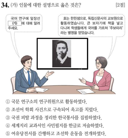 (가)인물은 주시경입니다. 한글의 대중화와 근대화에 힘쓴 인물로 국어문법, 말의 소리 등을 저술하였습니다.