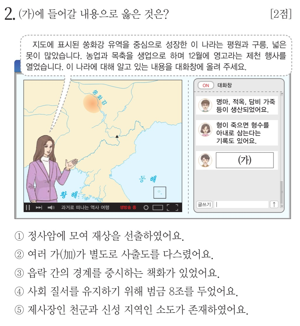지도에 보면 만주 한복판에 자리잡은 나라입니다. 우리의 역사와 맞닿아 있는 나라는 부여, 고구려, 앞서서 있었던 고조선... 그리고 발해가 있습니다. 그런데 여기서 특이할 만한 부분은 영고라는 12월 제천행사가 있다는 것입니다. 이 나라는 부여이고 부여와 관련있는 것이 (가)에 들어가면 됩니다.