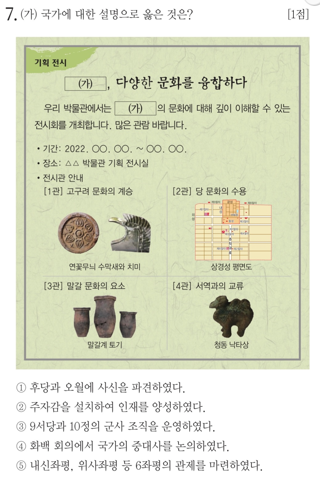 고구려 문화, 당의 문화, 말갈계 문하, 서역의 문화가 조화된 (가)국가는 발해입니다.