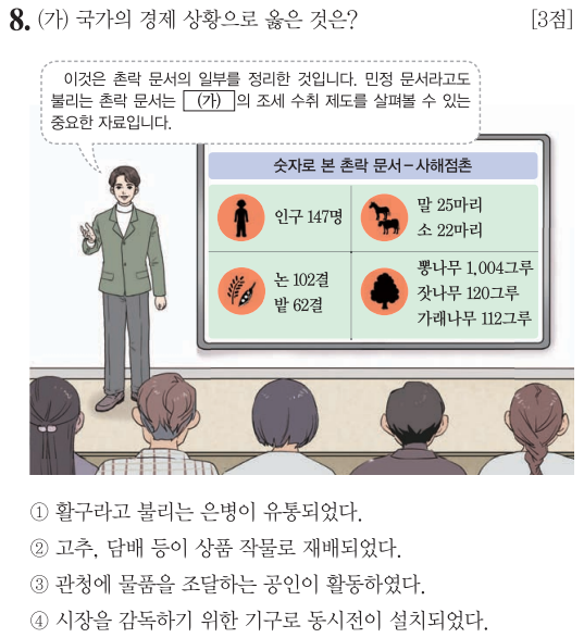 촌락문서(민정문서)는 일본에서 발견 된 것으로 신라의 조세와 관련된 내용으로 되어 있습니다. 3년 마다 한번씩 작성되지만 매년 조사하여 기록했다고 합니다. (가)국가는 신라입니다.