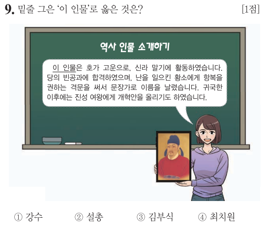 토황소격문의 내용이 있습니다. 진성여왕에게 시무 10조를 건의하였으나 받아들여지지 않자 역사에 흔적 없이 사라진 인물입니다. ""이 인물""은 최치원입니다. 최치원은 최연소 빈공과 합격자로 유능한 실력을 갖췄지만 진골출신이 아닌 6두품 출신이라 신라에서의 그 명성이 활용되지 못한 점이 많이 아쉬운 부분입니다.