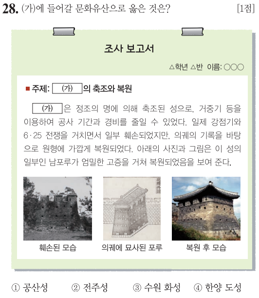 정조의 명에 의해 축조된 성... 계획도시이자 정약용의 거중기의 발명으로 축조 기간이 단축된 이 성... 수원화성입니다.