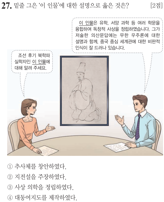② 지전설, 지금으로 하면 지동설을 주장한 조선의 위인은 홍대용입니다.