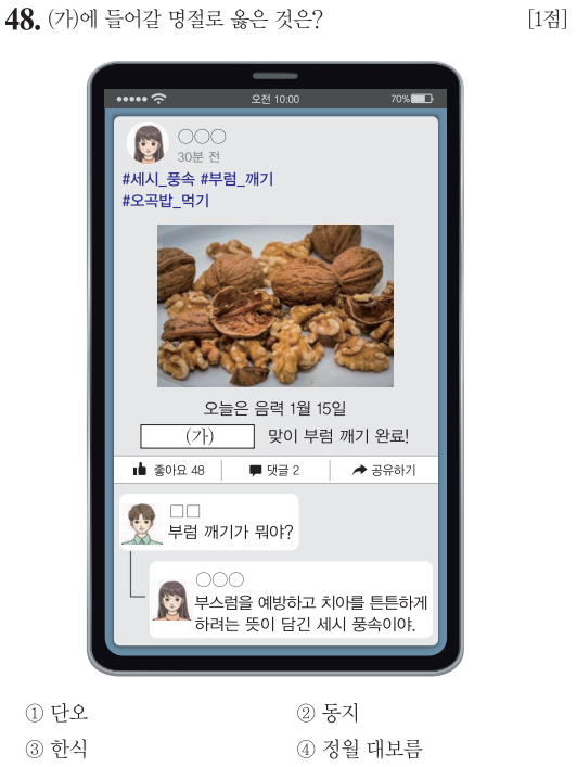부럼을 깨먹는 풍습으로 부스럼을 예방하고 치아가 튼튼하게 하는 세시풍속, 이는 정월대보름(음력 1월 15일)입니다.