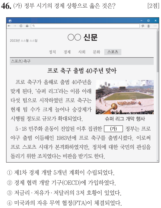 1983년 프로축구가 출범했습니다. (가) 정부는 전두환 정부입니다. 전두환 정권은 3S정책을 적극 실시했습니다. SPORTS / SEX / SCREEN 등으로 선정적이고 흥미유발을 국민들에게 심어주어 정치 권력에 관심을 갖지 못하게 하여 정권의 안정적인 국가 운영을 위한 의도였습니다.