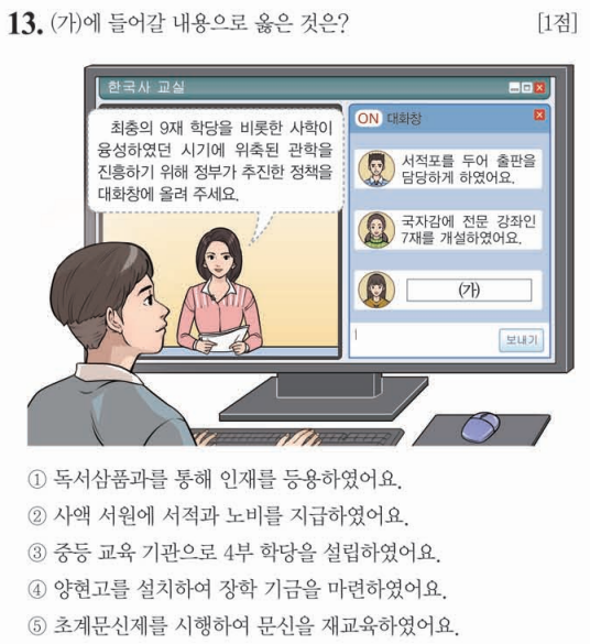 국자감에 서적포라는 출판부를 둔 것은 숙종때이며 국자감에 7쟁와 양현고(장학금 제도)를 실시한 것은 예종때입니다.