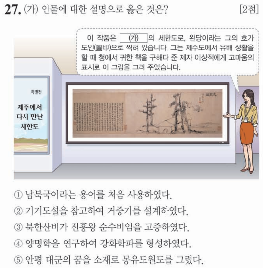 세한도를 그린 인물 (가)는 김정희입니다. 김정희의 호는 추사로 그가 쓴 글씨체를 추사체라 합니다. 김정희는 금석학, 비석을 연구하는 학문에 견해가 밝은 분이었습니다.