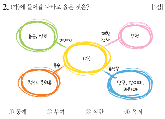 이 문제는 초기 철기시대의 여러나라의 특징을 잘 확인해야 풀 수 있는 문제입니다. 군장국가이며 부족장의 호칭이 읍군, 삼로인 나라 / 제천행사가 무천이 나라 / 책화와 족외혼이라는 혼인제도가 있는 나라 / 특산물로 단궁(짧은 활), 반어피(바다표범과 같은 동물들의 가죽), 과하마(과일나무 아래도 지날 수 있는 작은 말) 등과 같은 특산물이 있는 나라