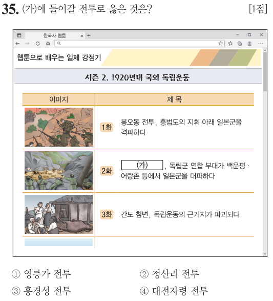 정답은 (가)에 해당하는 부분은 청산리 전투, 2번입니다.