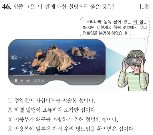 위 자료에서 보여주는 섬은 대한민국 국민이면 모두 알 수 있을 것입니다. 알아야만 합니다! 바로 독도입니다. 독도와 관련있는 설명으로 옳은 것을 고르시면 되는 문제입니다.