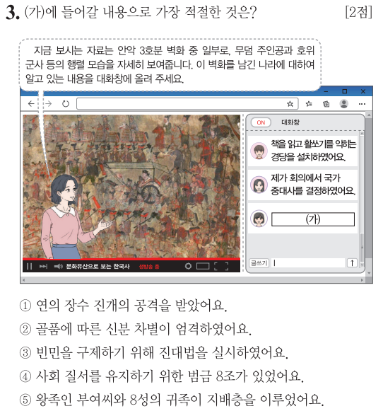 안악 3호분은 굴식돌방무덤 양식을 초기부터 사용하였던 고구려입니다. 귀족회의는 제가회의이며, 무예와 학문을 가르치는 경당이라는 교육기관이 있었습니다.