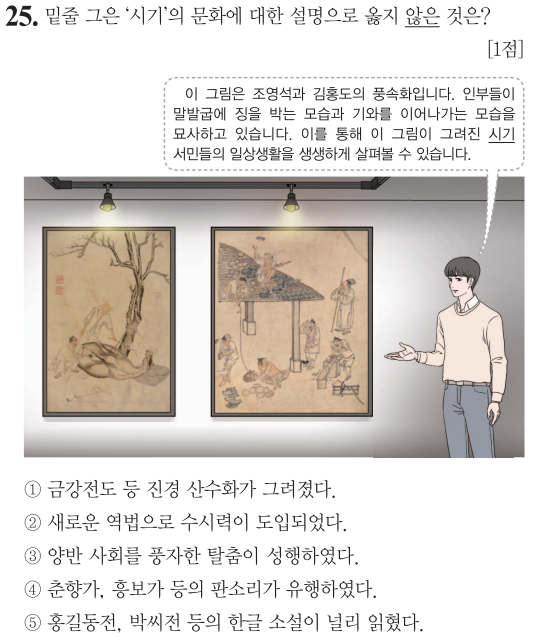 김홍도의 풍속화가 그려진 시점은 조선후기입니다. ""시기"는 조선후기의 모습으로 옳지 않은 것을 고르면 됩니다.