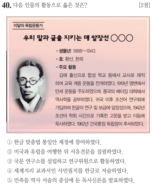 조선어학회 사건으로 일본에 고초를 겪은 한뫼라는 호를 쓰는 이 사람은 이윤재입니다. 이윤재는 조선어 학회에서 한극 맞춤법 통일안을 제정하는 중요한 역할을 수행하기도 했습니다.