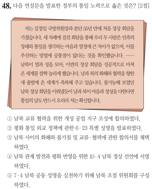 ⑤ 1972년 7.4남북 공동 성명은 자주, 평하, 민족 대단결이라는 3대 원칙에 의해 천명된 것입니다. 박정희 정부입니다.