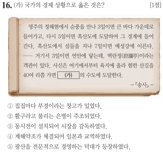 명주는 강원도 동해안이며, 근바다 가운데는 대한해협을 말합니다. 흑산도는 남해에서 서해로 진입하는 지역이며... 예성강은... 바로 고려의 최대 무역학 벽란도가 있는 곳입니다... 당연히 (가)국가는 고려를 말하며 40여리 쯤에 수도 개경이 위치합니다.