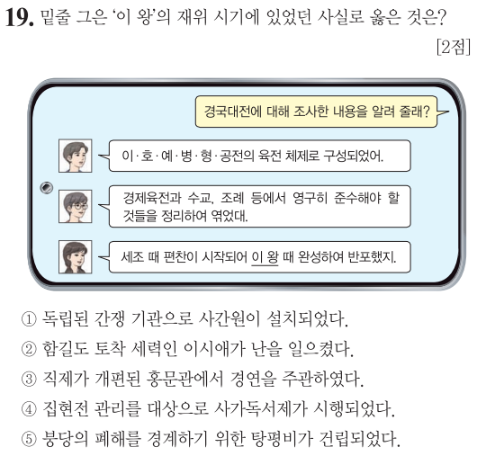 ③ ㉢의 부세와 부역은 많은 여타 세금과 무료로 징발된 노동력 징수를 의미합니다. 그러나 예송 논쟁은 효종과 효종비의 상을 당하였을 당시 비록 나이 어린 계비이지만 효종의 어머니었던 자의대비의 상복을 두고 남인과 서인이 대립한 사건입니다.