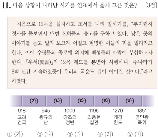 ② (나) 왕규의 난은 고려 2대 왕인 혜종때입니다. 도표상으로 성종이 즉위했던 시점은 혜종과 목종사이인 (나)가 정답입니다.