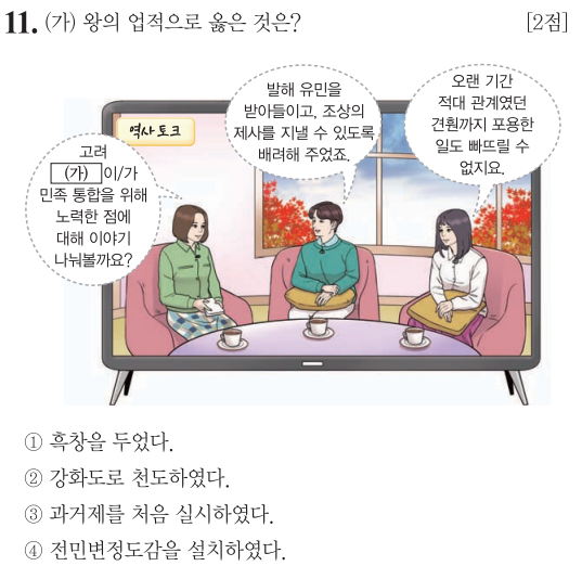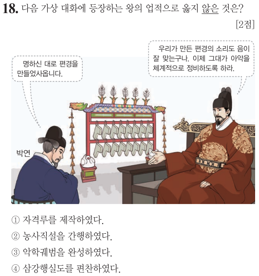 아악을 체계적으로 정비하고.. 박연이 등장합니다. 이는 조선 세종대왕때의 일입니다. 세종대왕의 업적과 관련 없는 것을 고르면 되는 문제입니다.