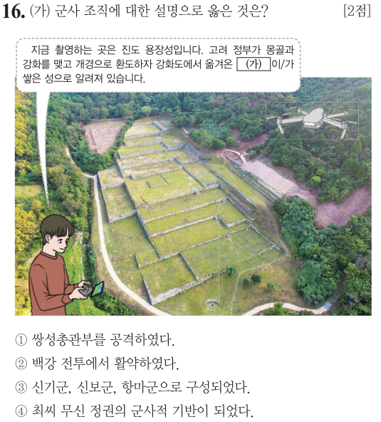 진도... 고려 정부가 몽골과 강화를 맺었다는 부분은 고려가 몽골의 힘에 굴복한 상황으로 이에 저항한 삼별초는 최후까지 대몽항쟁을 이어가고자 진도, 제주도에 이르기까지 맞서 싸웠지만 실패하고 말았습니다. (가) 군사 조직은 삼별초입니다.
