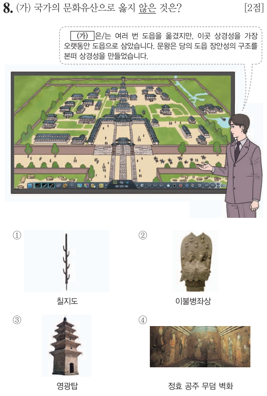 상경성을 오랫동안 도읍으로 삼고... (가)나라는 발해입니다. 발해의 문화유산이 아닌 것을 고르면 됩니다.