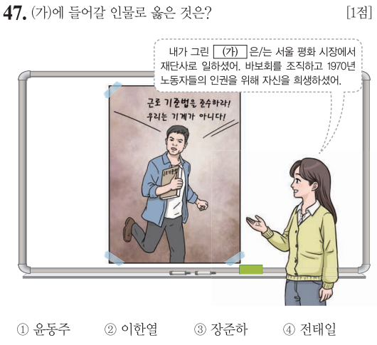 1970년... 근로기준법을 준수하라 주장하여 자기를 스스로 불태워 노동자들의 삶을 돌아보게 한 인물은 전태일입니다.