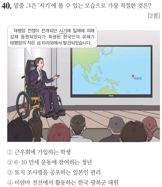 태평양전쟁은 1939~45년 2차세계대전이 종결되는 지점까지 있었습니다. 밑줄 그은 ""시기""에 볼 수 있는 모습을 고르면 됩니다.