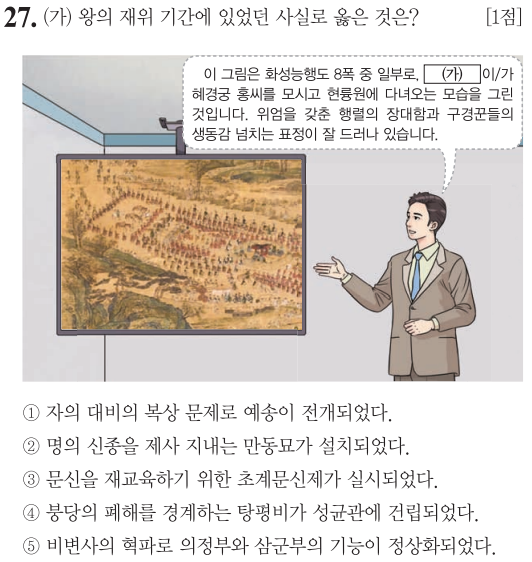 화성능행도를 보면 바로 알 수 있을 것입니다. 화성은 정조가 수도 천도를 목적으로 만든 계획도시입니다. (가)왕은 정조입니다.