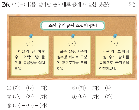 (다) 금위영은 수도 방어를 위해 만든 5군영 중 가장 마지막에 만들어진 중앙군으로 숙종때 만들어졌습니다.