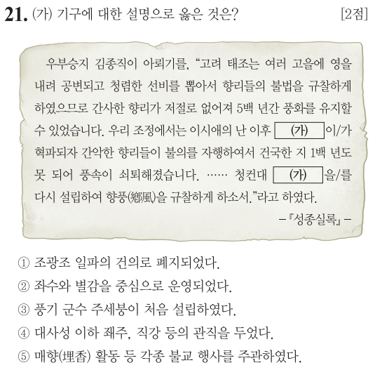 (가)기구는 향리들의 불의한 상황, 지방 향촌 사회를 규찰(; 규칙하에 감독하자)하자는 의견을 보아 유향소 혹은 향청이라 할 수 있습니다.