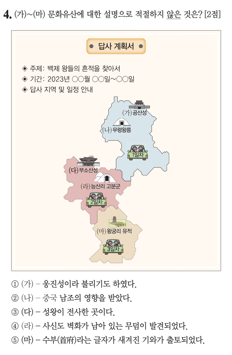 ③ 성왕이 전사한 곳은 관산성전투에 의한 것으로 관산성은 충북 옥천입니다. 부소산성은 백젱의 마지막 수도 사비에 있는 도성입니다.