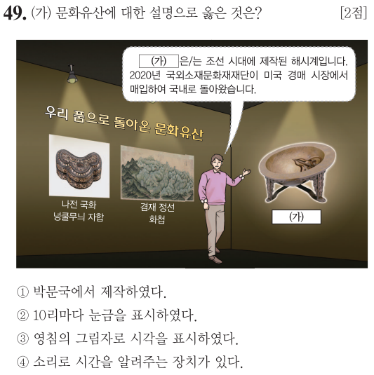 (가)는 앙부일구, 해시계라 불리는 문화유산입니다.