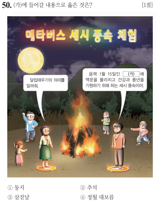 ④ 정월 대보름은 음력 1월 15일로 달집태우기 여름 더위를 물러나게 하는 풍습, 쥐불놀이 등이 있습니다.