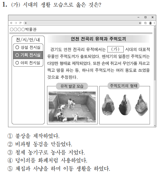 공부하시다보면 아시겠지만 연천 전곡리 유적, 공주 석장리 유적 등은 대표적인 구석기 시대 유적입니다. (가)시대는 구석기 시대이며 구석기 시대 유물에 대해 확인하는 문제입니다.