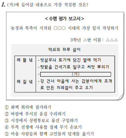 (가)에 들어갈 내용을 고르면 되는 문제입니다. 농경과 목축이 시작된 시대는 신석기시대입니다. 신석기 시대와 관련한 내용으로 옳은 것을 고르면 됩니다.