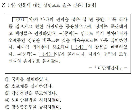 권력을 잡은 10년 동안 / 토목공사(경복궁 중건) / 임금의 친아버지 / 최익현의 상소로 실권 / 민씨.. 이러한 단서를 종합해 본다면 (가) 인물은 흥선대원군입니다. 흥선대원군은 어린 고종을 대신하여 1863~1873년, 10년 동안 통상수교거부정책을 구현하였습니다. 이 과정에서 조선의 통치질서 확립이라는 수훈을 거두기도 했지만 조선의 근대화가 늦어져 힘든 조선의 상황이 서구열강과 청, 일본 등으로 하여금 더 더뎌지는 아쉬운 행보를 보였다는 평가를 받았습니다.