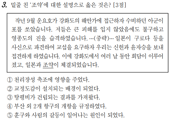 운요호사건(1875년)이 원인이 되어 강화도조약(1876년), 정식 명칭인 조일수호조규가 체결되었습니다.