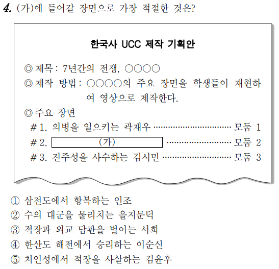 곽재우, 김시민을 보면 바로 알 수 있죠? 1592년 일본이 쳐들어온 임진왜란(1592년) 당시의 주요 장면에 대해 옳은 것을 고르면 되는 문제입니다.