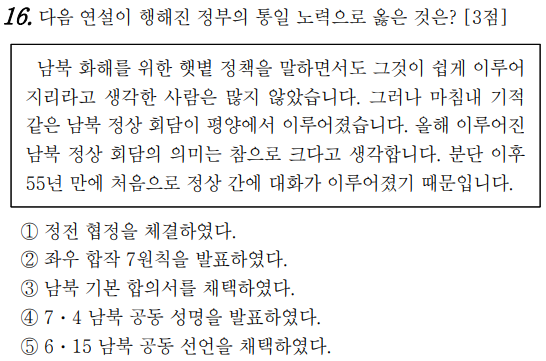 ③ 남북기본합의서 채택(1991년)은 노태우 정부때입니다. 남북한이 화해 및 불가침과 교류협력에 관해 기본 합의를 한 것입니다.