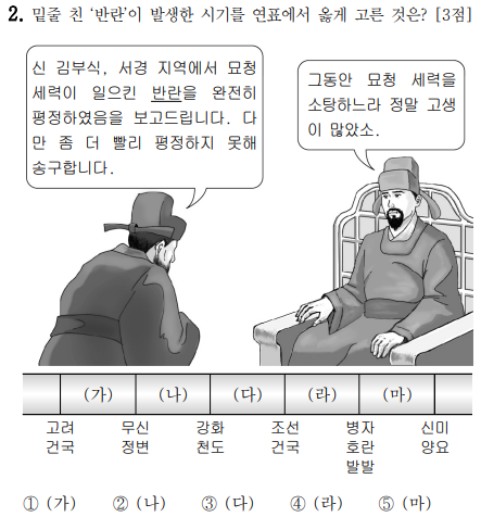 묘청의 서경천도운동(1135년)임을 바로 알 수 있습니다. 당시 왕은 인종이었으며 이자겸의 난(1126년)이 진압된지 얼마 되지 않은 시점이었습니다. 인종은 초반에 묘청의 의견을 수용하여 천도를 결심했다가 문벌귀족의 세력이 여전함을 보고 아쉽지만 그 뜻을 접어야만 했습니다.
