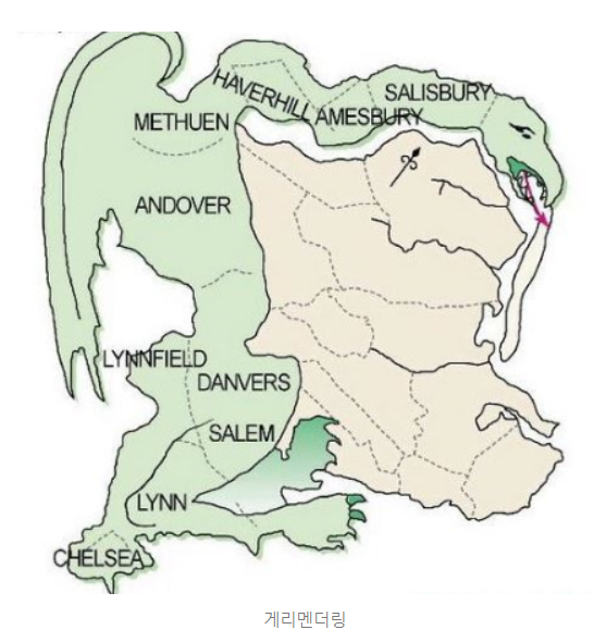선거구는 자연적인 구역의 형태나 문화적인부분 사람들의 거주 상황도 고려하여 구획되는데 이러한 상황은 무시한체 공화당에 유리한 방향만을 고려하여 구회하다보니 마치 도마뱀(Salamander)과 같은 지역구의 모형으로 보였습니다. 이를 희화하여 주지사 이름 게리와 합성어로 게리맨더링이라는 단어가 나왔습니다.