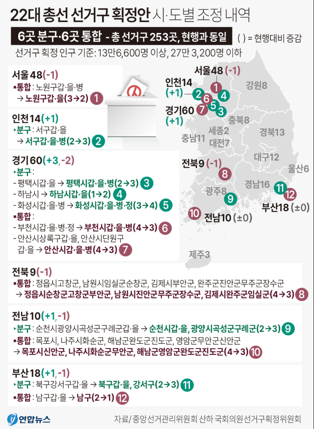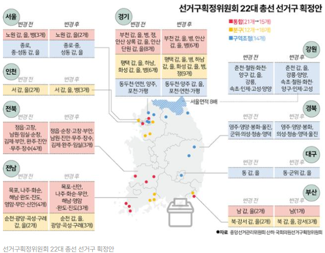 인구이동, 행정구역의 변경 등의 이유로 선거구가 약간 조정되거나 선거구 자체가 2개에서 1개로 통합되거나 1개의 선거구가 2개로 분리되는 경우가 생겨났습니다. 이번 2024년 4월 10일에 실시되는 대한민국 22대 국회의원선거에서는 21대 총선과 같이 253명의 지역구 국회의원을 선출하며, 47명의 비례대표 국회의원을 선출할 것으로 계획되었습니다.