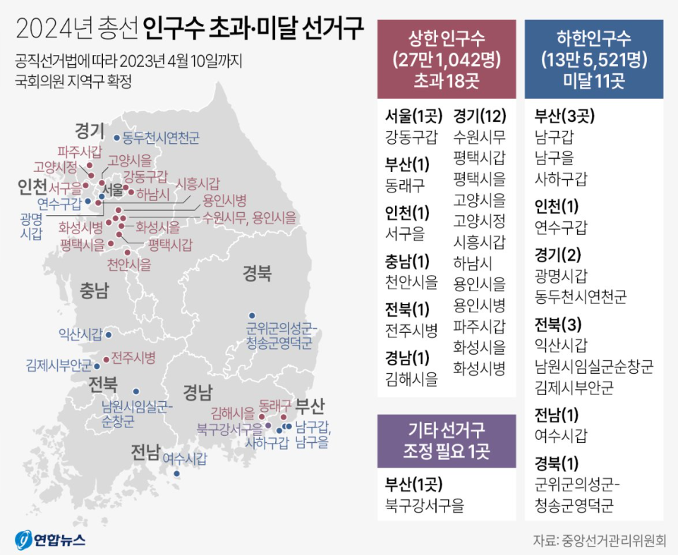 모든 선거구가 일괄적으로 동일한 인구수로 나누어 획정할 수 없는만큼 최소 13만 6천명, 최대 27만 3천명의 선에서 지역구 1개를 설치합니다. 도시는 인구가 많고 지역이 좁다보니 상대적으로 인구가 많아도 1개의 지역구로 구성되는편이며, 농촌은 인구는 적지만 지역이 넓다보니 상대적으로 인구가 적어도 1개의 지역구가 설정되는 것이 통상적인 기준이라 할 수 있습니다.