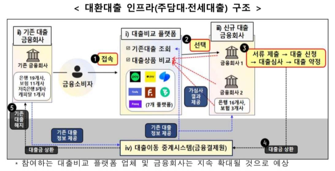 현재 주담대 대환 참여 금융회사는 7개의 대출비교 플랫폼과 16개의 금융회사 어플을 활용하여 갈아탈 대출 조건을 비교할 수 있습니다.