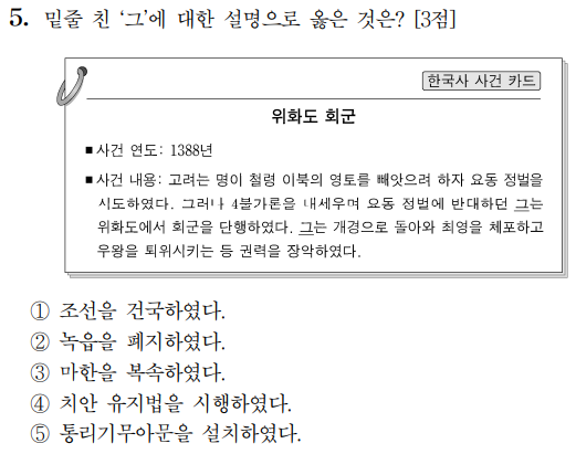 위화도 회군은 1388년에 요동정벌을 주도했던 최영장군과 우왕을 제거하고 이성계장군이 조선 건국을 위한 정치적, 군사적 권력을 장악한 전환점이 된 사건입니다. ""그""는 바로 이성계입니다.