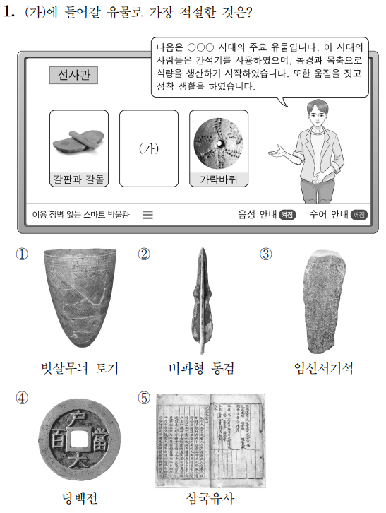 (가)시기는 신석기 시대이며 다음 유물들 중에서 신석기 시대에 해당하는 유물을 고르면 되는 문제입니다.
